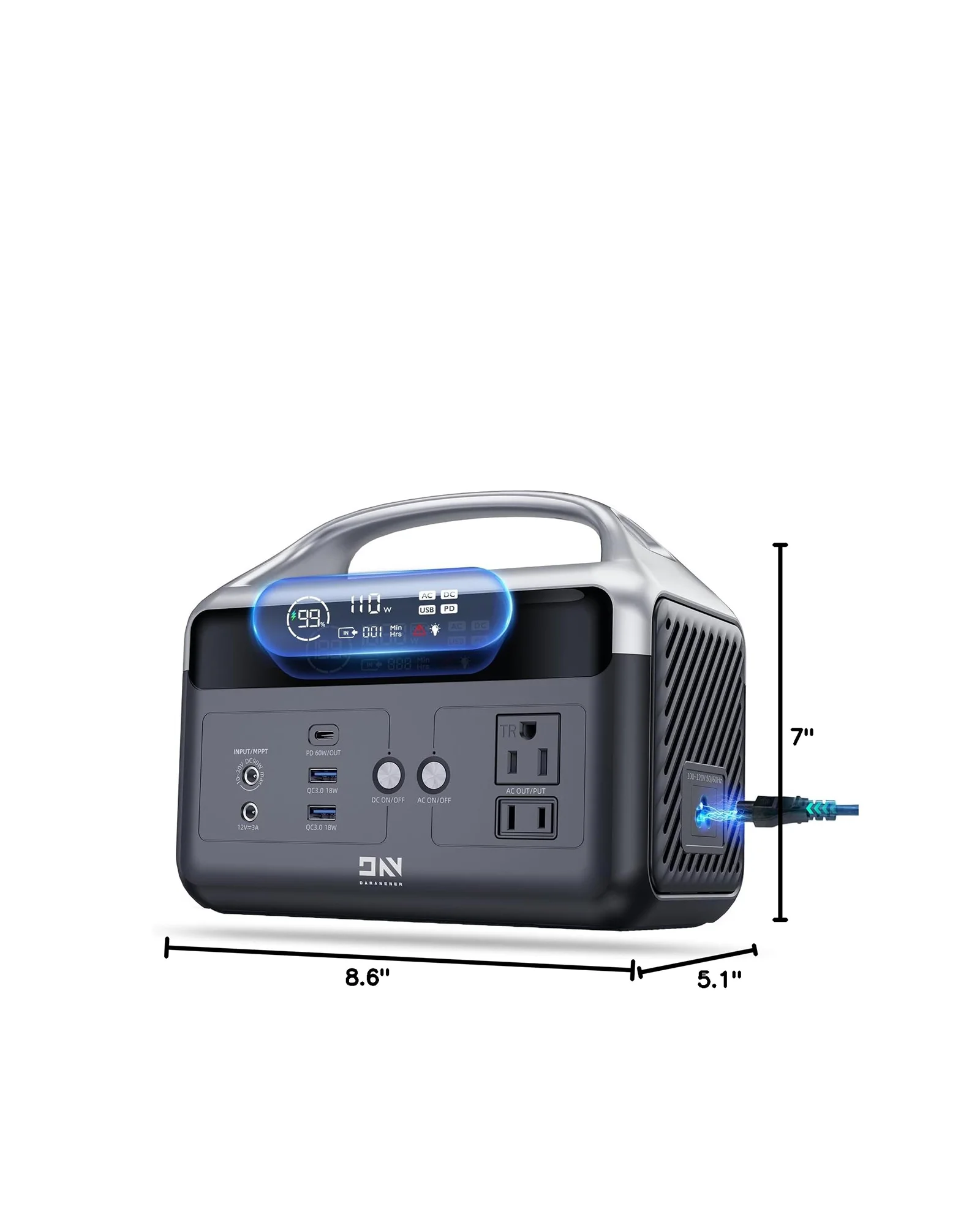 【Super Fast Charging】Three charging options, 100% full charge in 1.5 hours via home outlet (110W AC Super Fast Charge), or 2 hours via car charger or solar panel (MPPT 90W Max (11-30V 4A Max))