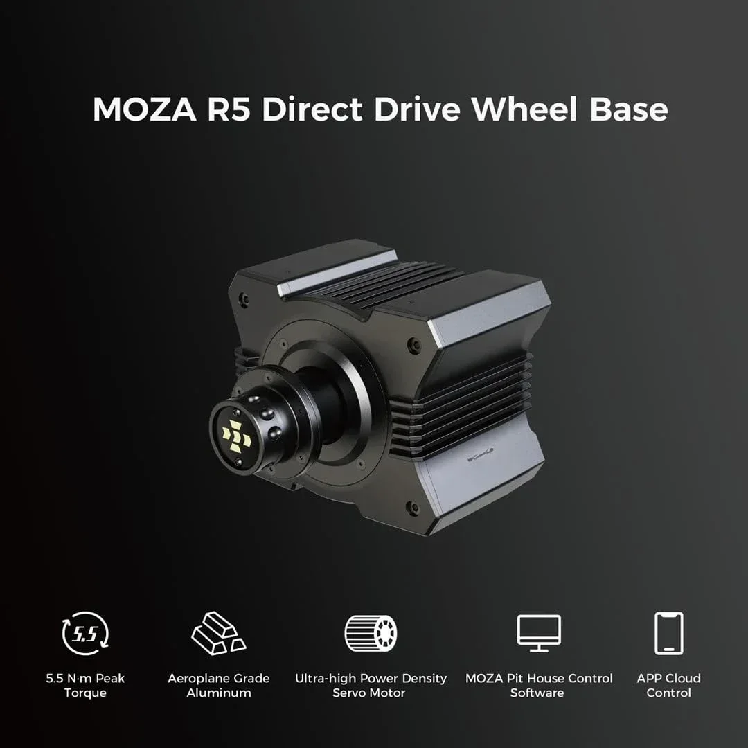 R5 Direct Drive Wheel Base. The R5 DD base delivers a punchy 5.5Nm DD power with ultra-low torque ripple to achieve a instant reaction. Its intelligent temperature control and aviation-grade aluminum base housing offer the sim racers safe and reliable performance. The motor encoder sports a 15-bit ultra-high resolution, ensuring steering is accurate and gives a true-to-life feel