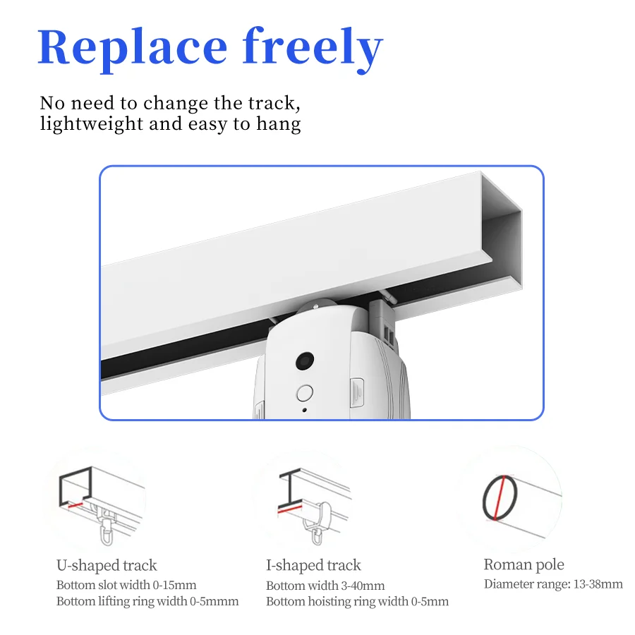 Widely Used: Electric Curtain Robot suitable for Roman Rod Track(Roman Rod diameter range:13-38mm), U shaped Track (bottom slotwidth 0-15mm, bottom ring width 0-5mm), T shaped Track (bottomwidth 5-40mm, bottom ring width 0-5mm)